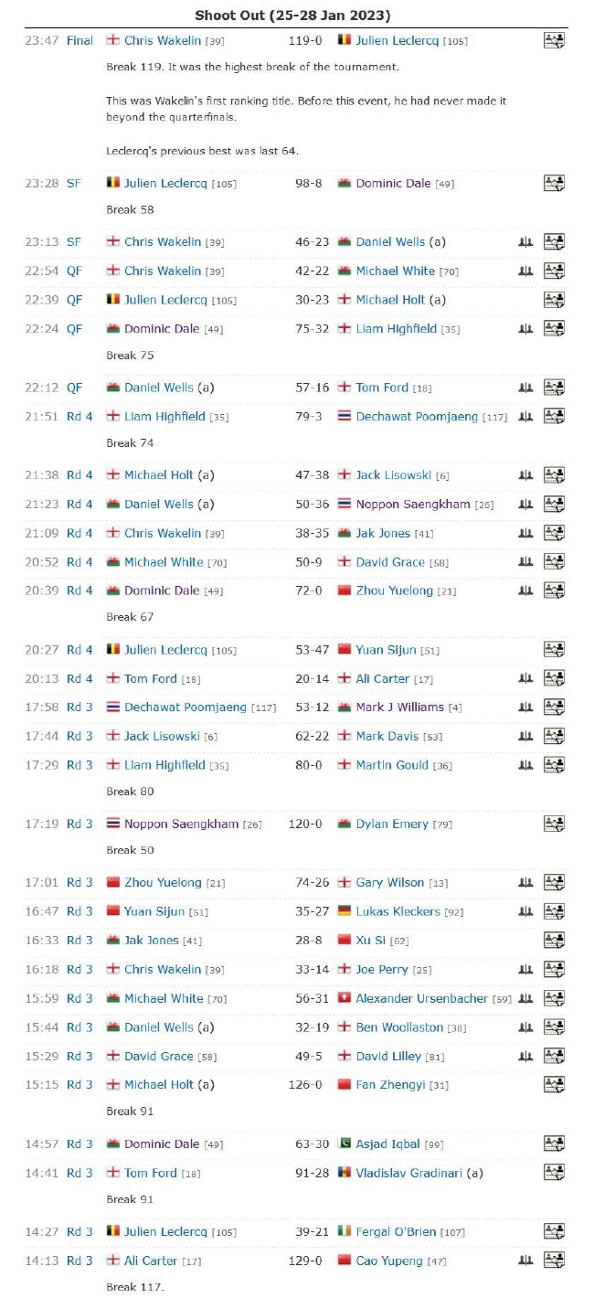 北京时间1月29日凌晨,2023斯诺克单局限时赛第4比赛日战罢。当日进行的是剩余全部5轮比赛。5位中国选手中只有周跃龙和袁思俊打进第四轮,并最终止步此轮;而TOP16种子中剩余的3位,只有6号种子杰克-利索夫斯基闯入第四轮并止步于此。最终,英格兰选手克里斯-韦克林以119(119)-0战胜比利时选手朱利安-勒克莱克,夺得生涯首个排名赛冠军,同时,他在决赛中打出的单杆119分也是本届赛事的单杆最高分。
