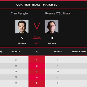 第二场同样是中英对决,对阵双方是田鹏飞和2号种子、现世界第一罗尼-奥沙利文。此前双方共交手过5次,“火箭”3胜2负稍占上风,且最近3次交手都是他胜出。比赛中,田鹏飞发挥非常出色,凭借4杆50+,以96(66)-9、96(51)-1、63-52、82(82)-4和74(73)-0连胜5局,大比分5-0横扫奥沙利文,职业生涯首次晋级排名赛4强。这是田鹏飞连续第2场击败“75三杰”,在正赛4场比赛中,他连续击败了2位世锦赛亚军和2位世锦赛冠军。