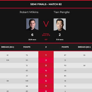 巧合的是,2场半决赛都是中英对决。在首场比赛中,田鹏飞对阵的是罗伯特-米尔金斯。