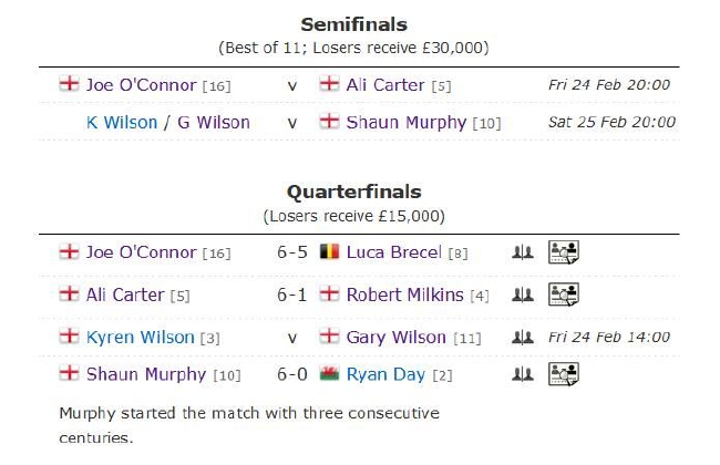 休息归来,第五局,布雷切尔打出单杆88分,以92(88)-0胜出,再次将大比分改写为3-2领先。不过此后,奥康纳凭借1杆80+,以85(85)-28和79-30连扳2局,大比分4-3反超。但接下来,比利时人则连续打出2杆50+,以65(56)-1和88(88)-0同样连胜2局,大比分5-4再次领先,并率先拿到赛点。关键时刻,奥康纳火力全开,凭借全场唯一1杆破百和1杆50+,以125(125)-0和77(57)-35再胜2局,在挽救了1个赛点后,最终以大比分6-5逆转晋级4强。