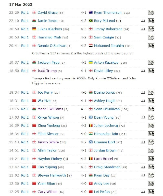 另外,威尔士名将瑞恩-戴在对阵英格兰业余选手斯蒂芬-哈尔沃斯的比赛中,没能打出1杆50+,以9-93(59)、16-114(72)、68-46、32-65和57-71,大比分1-4爆冷出局。