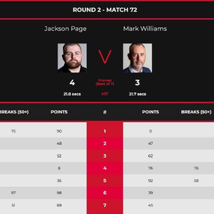 第三时段中,2位出战的TOP16种子一输一赢。在一场威尔士德比中,8号种子马克-威廉姆斯虽然凭借2杆50+连胜3局,一度大比分3-2反超拿到赛点,但关键时刻,他再次掉链子,在连输2局后,以0-90(75)、47-48、62-52、76(76)-8、92(58)-35、39-98(97)和45-69(51),大比分3-4惜败于杰克逊-佩奇,无缘32强。