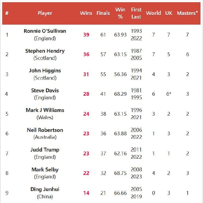 他在克鲁斯堡冠军榜上,也与约翰-希金斯并列排在第四,仅次于斯蒂芬-亨德利(7个)、罗尼-奥沙利文(7个)和史蒂夫-戴维斯(6个)。如果此番能够夺冠,那么,他就将以5冠超越“巫师”,在该榜单上独占第四位。