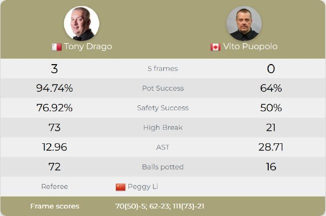另一场比赛中,托尼-德拉高凭借不可思议的速度和成功率,以70(50)-5、62-23和111(73)-21连胜3局,大比分3-0横扫加拿大冠军维托-普波罗。比赛中,他的平均出杆时间达到12.96秒!1/4决赛中,德拉高将对阵马克-戴维斯。