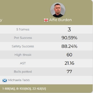 本场比赛,阿尔菲-博登凭借3杆50+,很快就以88(56)-1、103(60)-8和63(51)-22连胜3局,大比分3-0横扫1997年世锦赛冠军肯-达赫迪,晋级8强。他将在1/4决赛中对阵亨德利和摩根之间的胜者。