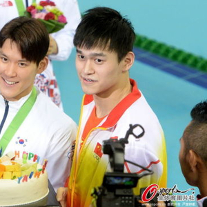 先是摸头,过两天是摸下巴,今晚更是有突然现身送蛋糕的意外惊喜……中韩两位国宝级游泳选手孙杨[微博]和朴泰桓,赛场内外惺惺相惜的友爱互动,把今晚落幕的仁川亚运会游泳赛推向高潮。