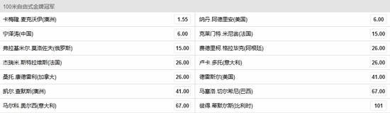 从机构开设的100米自由泳夺冠赔率看,麦克沃伊夺冠优势相当大,目前赔率低至1.55;并列第二的是美国选手阿德里安和中国选手宁泽涛,他们同为1赔6.00,此3人组成了100米自由泳夺金的第一集团。莫洛佐夫等人都在1赔15及以上,很难对他们形成威胁。宁泽涛在该项目中期待“爆冷”夺金的同时,完全有能力拿下一枚银牌。