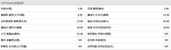 奥运游泳夺冠赔率孙杨拿俩榜首 宁泽涛被看好