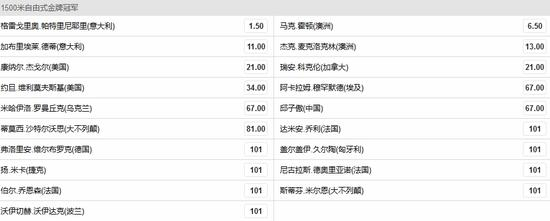 1500米自由泳方面,中国选手邱子傲以1赔67的夺冠赔率,仅仅排名第10位。排名首位的是意大利选手帕特里尼耶里,他的领先优势较大,赔率为1.50,而第二位的霍顿已经高达6.50。此项目的冠军似乎非意大利人莫属。