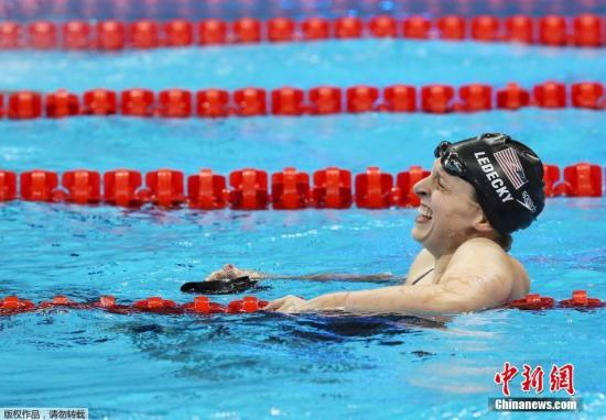 当地时间8月12日,2016里约奥运会女子800米自由泳决赛中,美国名将莱德基游出8分04秒79,打破世界纪录,获得金牌。