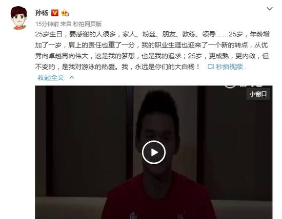 孙杨在微博中上传了一段视频,“大家好,我是孙杨,很感谢大家送我的生日礼物和祝福。一路走来,大家的关心与厚爱一路陪伴着我,我一直心存感激。即将过去的2016年既有成功的喜悦,也有功败垂成的遗憾。不过喜悦也好,遗憾也罢,一切都已经成为过去。年龄又增长了一岁,对自己的要求也更严格了,升国旗、奏国歌是我不变的追求,是我始终的目标,新的一年我会努力做得更好,不负大家对我的厚爱,不负青春美好时光。”