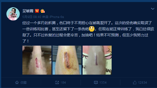 等到5月初,吴敏霞把小腿胫骨划伤的三张照片发到微博时,尽管皮开肉绽的伤口让人看着就疼,但她自己知道这道坎算是迈过去了:“经过一个多月的折腾,伤口终于不用担心再被跳裂开了。这次的受伤确实耽误了一些训练和比赛,甚至还留下了一条伤疤。但现在能正常训练了,我已经很欣慰了。只不过恢复的过程会更辛苦,加油吧!结果不可预测,但至少我努力过了!”
