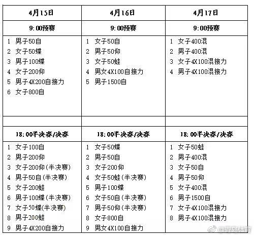 2017全国游泳冠军赛赛程:4月10日-17日战青岛