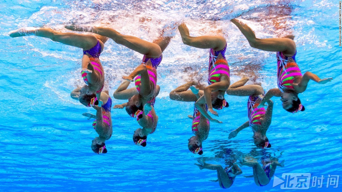 花泳运动之所以能以轻盈优美的形态呈现在观众面前,很大程度上是因为运动员们即使在最紧张的常规动作要求里,也要努力保持轻松的形象。