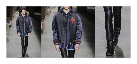 音乐仍是厚重的摇滚节拍,模特们编着发、画上纹身,踩着自信的步伐鱼贯而出,配上地毯图案的上衣以及与皮夹克、皮裤、飞行员夹克、双排扣短大衣等的搭配,彷佛是来自波西米亚的战士的现代军装版。