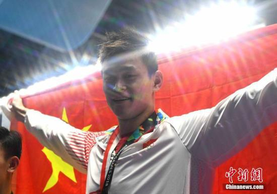 当地时间8月24日,孙杨完成了第十八届雅加达亚运会的最后一场比赛——男子1500米自由泳项目,并以14分58秒53的成绩顺利夺冠。中新社记者 王东明 摄
