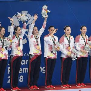 根据亚运会的新规,花游比赛不得兼项,因而刚刚夺得双人项目金牌的蒋文文、蒋婷婷姐妹俩并未参加集体项目的比拼。不过,八位年轻的姑娘同样不负众望,她们在集体技术自选的《美丽的贝加尔湖》、集体自由自选的《凤舞国粹》两个曲目上都将自己的水平发挥得淋漓尽致,并轻松夺冠。参赛的八位女孩分别是呙俐、梁馨枰、尹成昕、肖雁宁、冯雨、常昊、王芊懿和王柳懿。中国花游队的北京籍教练汪洁在赛后表示,“能够为代表团夺得亚运会第100金,我们非常开心,也感觉非常幸运。姑娘们在比赛中发挥得非常棒,她们配得上这个分数。我们的口号就是在雅加达绽放最美的自己!比出最美的风格”。值得一提的是,百金荣誉已经是第二次降落在中国花游队的姑娘们头上了。早在2006年的多哈亚运会上,中国代表团的第100枚金牌就是由中国花游队在集体项目上取得的,当时蒋文文、蒋婷婷姐妹俩就是冠军成员。如今,姐妹俩依然在为国拼搏,而其余队友早已退役。