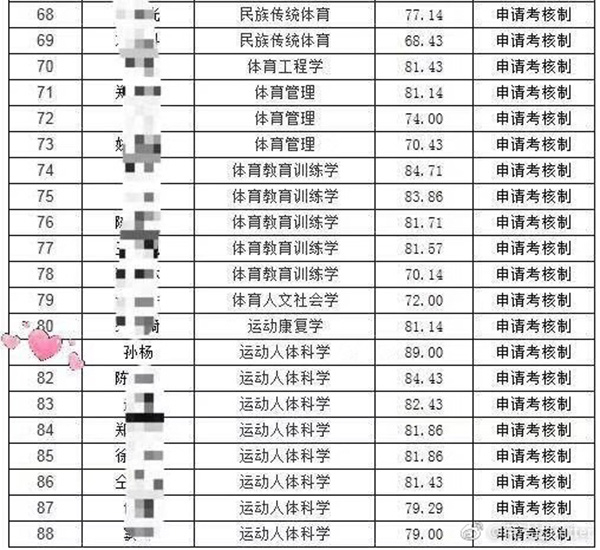 10日,在上海体育学院研究生处的官网上,记者看到了一份《上海体育学院2018年博士研究生拟录取名单公示》,里面确实有孙杨的名字。他的报考专业为运动人体科学,面试分数则为89分。