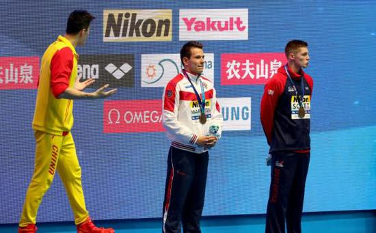 7月23日,在光州世锦赛上又发生了争议性一幕。在男子200米自由泳决赛后,并列获得铜牌的英国选手邓肯·斯科特在颁奖典礼上拒绝与获得冠军的孙杨握手以及合影。
