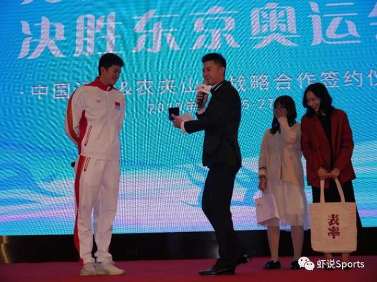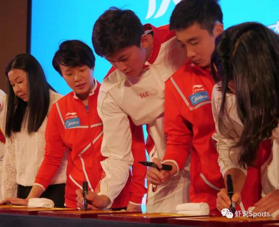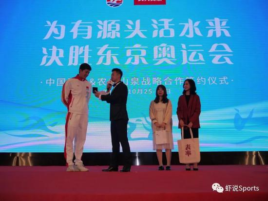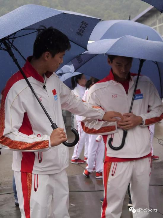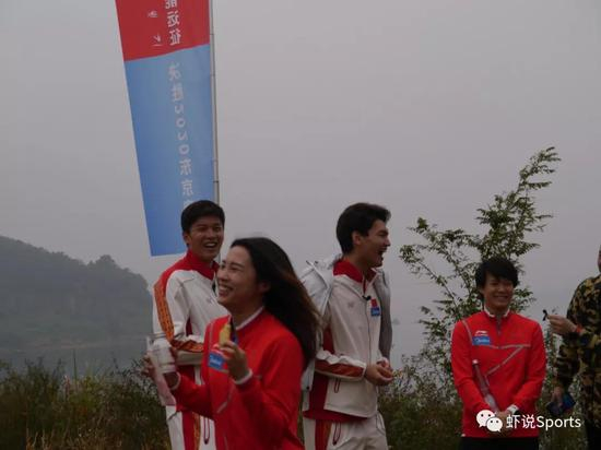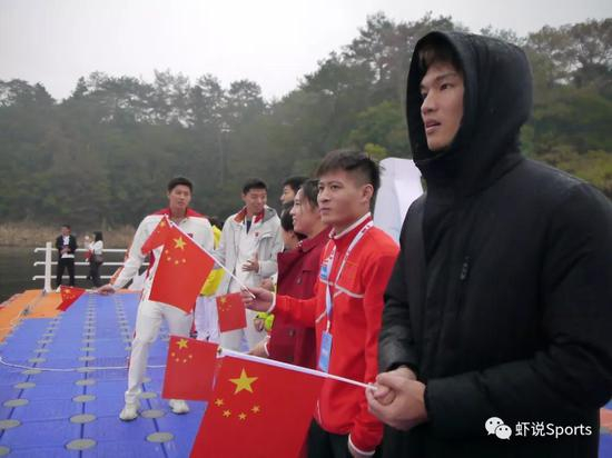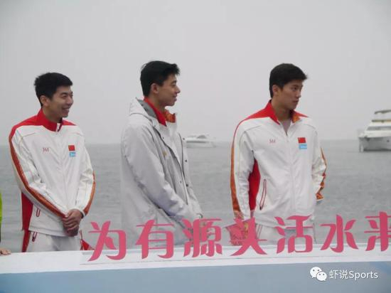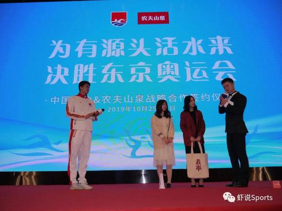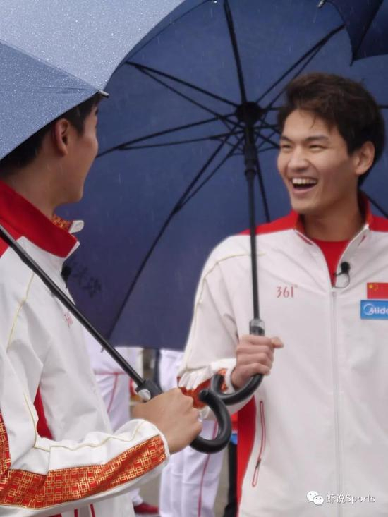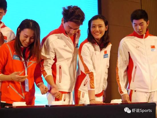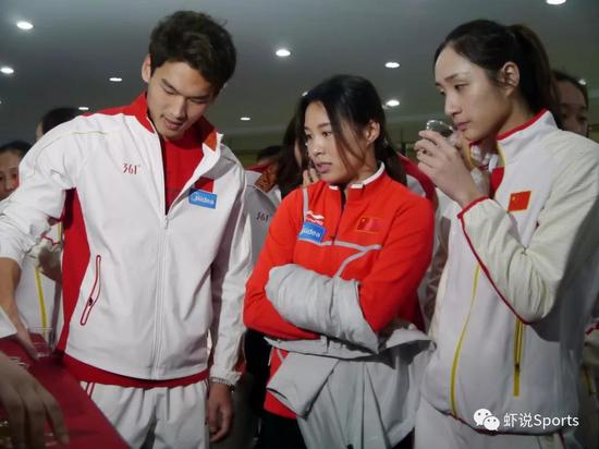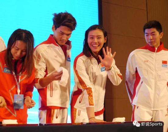 哈哈,他终于在两位奥运冠军(游泳)叶诗文和曹缘(跳水)之间,成功找到空挡。后来与泳迷互动环节,收到用心礼物的汪顺笑容格外灿烂。