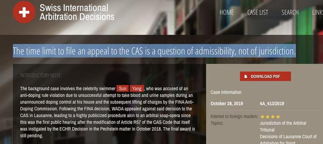 在“瑞士国际仲裁决定”网站上,有一篇题为“向CAS上诉的时限,是受理问题,并非管辖权问题(The time limit to file an appeal to the CAS is a question of admissibility, not of jurisdiction)”的记录。