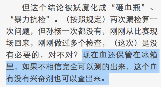 很难相信这段话出自孙杨团队律师之口。被采集起来血样,并没有被检查人员带走,等同于医疗废弃物。即便孙杨方仍妥善保管这一血样,它也不具备任何检测价值了。在听证会,以及各方讨论中都没有涉及这一被留下来的血样的再检测问题。