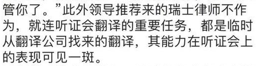 针对翻译,孙杨团队还有一种说法。孙杨母亲在2月29日朋友圈发布的内容中提到,“领导推荐来的瑞士律师不作为,就连听证会翻译的重要任务,都是临时从翻译公司找来的翻译,其能力在听证会上的表现可见一斑。”