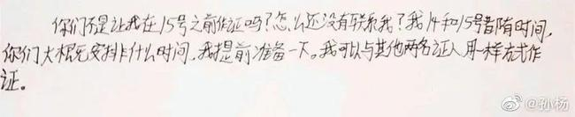 在同一条微博中,孙杨还贴出了一张图片,上面写有这样的字样:“你们不是让我在15号之前作证吗?怎么还没有联系我?我14和15号都有时间。你们大概安排什么时间,我提前准备一下。我可以与其他两名证人用一样方式作证。”值得一提的是,在这张图片上既无抬头,也无签名和时间。