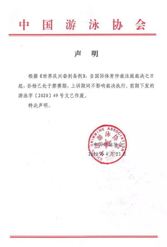 该文件特此声明:根据《世界反兴奋剂条例》,自国际体育仲裁法庭裁决之日起,孙杨已处于禁赛期,上诉期间不影响裁决执行。前期下发的游泳字2020-49号文已作废。
