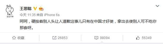 2016年8月8日王思聪在微博发文,疑似评价此事:“呵呵,硬按着别人头让人道歉这事儿只有在中国才好使,拿出去使别人可不吃你那套呀。”