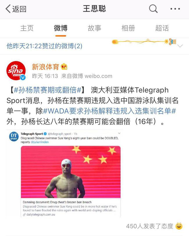 此次重回微博,王思聪也不忘吃体育圈的瓜。在撕阿水表哥之前,他点赞了新浪体育官微“孙杨禁赛期或翻倍”的新闻,内容是澳大利亚媒体报道,孙杨在禁赛期违规入选中国游泳队集训名单,他长达八年的禁赛期可能会翻倍。法新社报道,世界反兴奋剂机构已要求得到中方的合理解释。