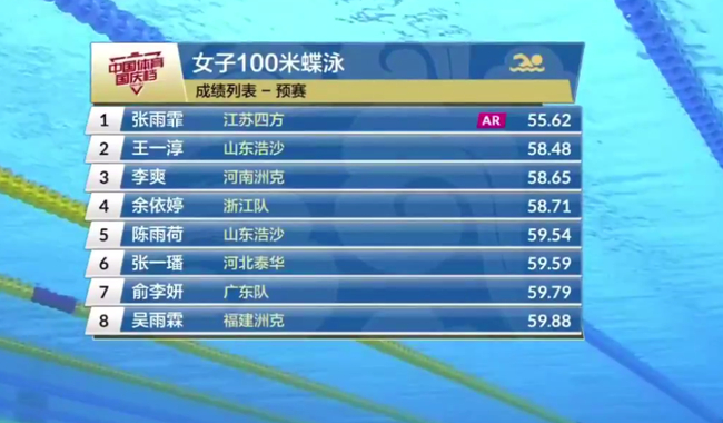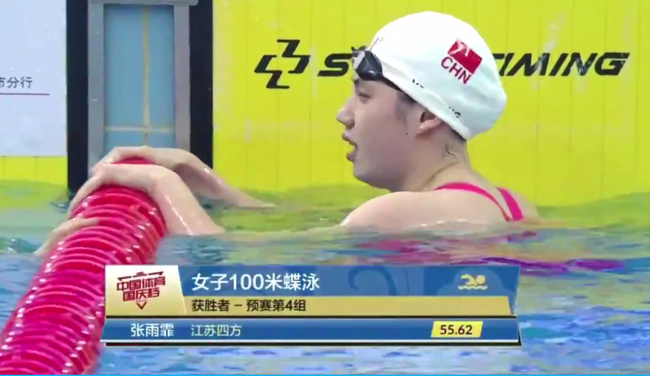 之前的女子100米自由泳预赛中,22岁的江苏队名将张雨霏以52秒90的成绩打破该项目全国纪录。这一成绩将原来由庞佳颖在2009年创造的全国纪录提升了0.23秒。