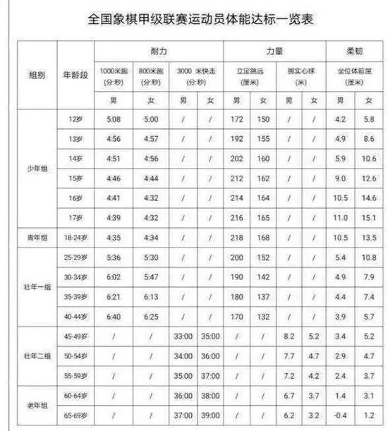 象甲联赛的《体能达标一览表》显示,运动员根据年龄被划分为5组,耐力类别45岁以下运动员要测试的是1000米/800米跑,45岁以上运动员测试的是3000米快走。