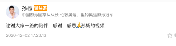 12月2日,孙杨也在网上发布了一段庆生视频,并向大家表示了感谢:“谢谢大家一路的陪伴,感谢,感恩。”这是孙杨自今年3月2日以来,首次在网上发声。