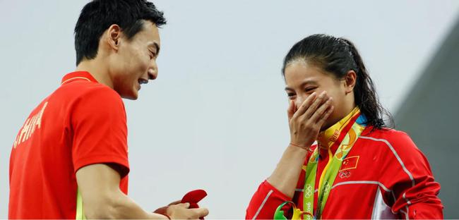 中国跳水队的金童玉女秦凯和何姿在2016年里约奥运会女子3米板颁奖仪式上情定终生。