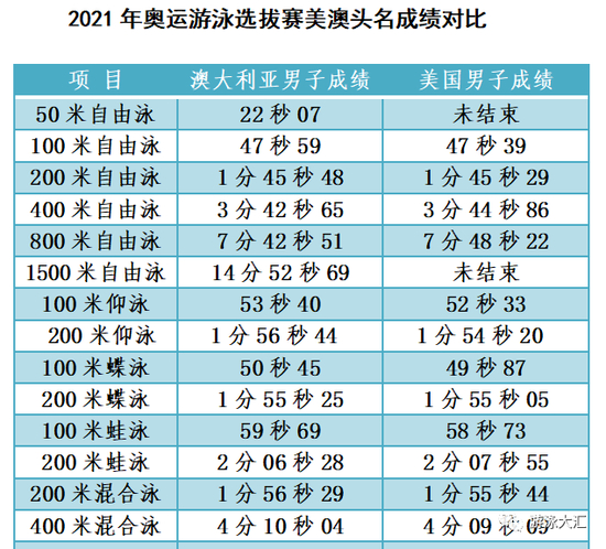 对比美澳两个游泳大国的选拔赛成绩,有不同亮点。不过澳大利亚选拔赛只有预赛、决赛,而且设置了比较高的达标线,选手在国内赛可能相对容易游出比较好的成绩。