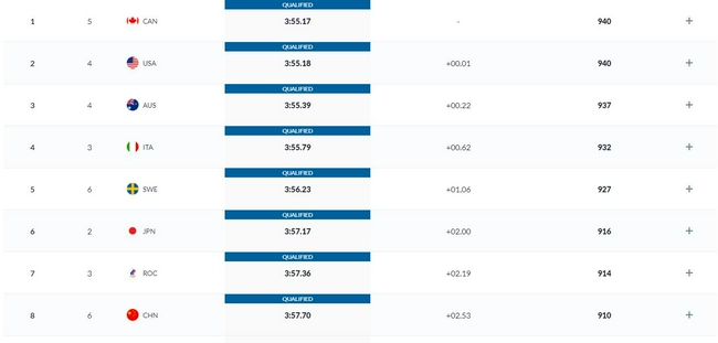 第二组加拿大队3分55秒17第一,美国3分55秒18第二。中国队以第八名身份惊险季军。