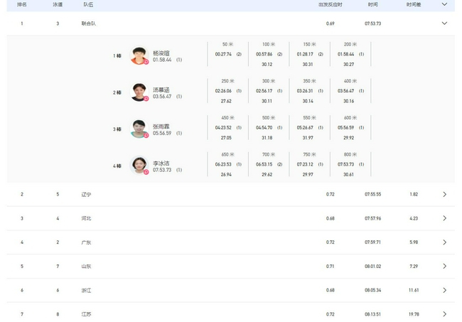第四棒李冰洁大战辽宁队的邱钰涵。700米邱钰涵领先李冰洁0.29秒。750米李冰洁反超邱钰涵0.38秒!最后李冰洁帮助联合队,以7分53秒73夺冠,避免了大冷门发生。