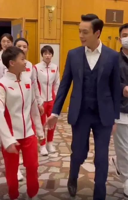 在现场,多位娱乐明星与全红婵互动。陈伟霆拉着她的手,边走边用粤语聊着天,邓超找到全红婵,蹲下身来与她合影……