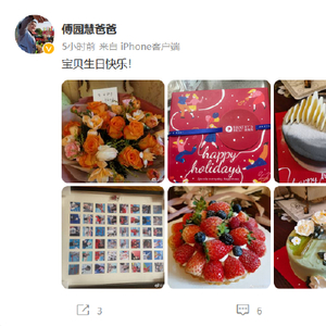 在微博上,傅春昇不仅晒出了给傅园慧定制的生日蛋糕以及别着写有“生日快乐 平安顺遂”卡片的鲜花外,还将48张傅园慧职业生涯中每个阶段的高光时刻照片做成了一个相框,并在微博配文写道:“宝贝生日快乐!”