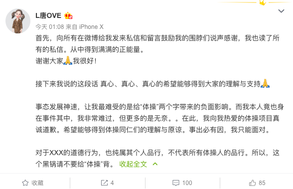 “事态发展神速,让我最难受的是给‘体操’两个字带来的负面影响。而我本人竟也身在事件其中,我非常难过,但更多的是无奈。。在此,我向我热爱的体操项目真诚道歉。希望能够得到体操同仁们的理解与原谅。事出必有因,我只能面对。”