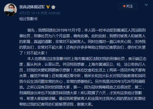 本人也想通过这条致歉书对上海市黄浦区法院对我的刑事处罚,表示端正态度,服从判决,认罪认罚。并且特别感谢,上海市黄浦区公、检、法公务执行人员,对我的关爱和照顾表示感谢!尤其在饮食和生活上(两菜一汤另外每天都有水果,睡觉开单铺)还有黄浦区看守所,杨所长和刘大队长对我百般教育和询问我今后生活问题非常的关心,非常的感谢他们。另外我是2020年3月26号刑满释放。之所以没有及时的回馈大家,第一,因为冠状病毒释放之后很迷茫,第二,刑满释放出来也不知道怎样回馈大家!所以耽搁了六天,才发布这条检讨致歉书,希望大家能够谅解。最后我希望被害人和全国关注我关心我的朋友们和曾经帮助过我的记者同志们能够原谅我,谢谢大家。