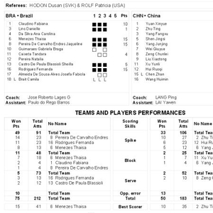 个人得分方面,整个一攻受阻进攻不畅的情况下,中国队多凭借朱婷的调整攻与巴西队周旋,朱婷赢得本队最高的10分,曾春蕾获得7分,惠若琪和杨珺菁双双获得6分,徐云丽入账4分,替补出场的袁心玥[微博]和刘晓彤[微博]分别赢得2分和1分,魏秋月[微博]贡献1分。巴西队四人得分上双,其中副攻塔伊萨、主攻杰奎琳和费-加雷三人均斩获全场最高的15分并列得分王,队长法比亚娜赢得10分,谢拉贡献5分,替补接应坦达拉入账4分,二传达尼-林斯得到1分。