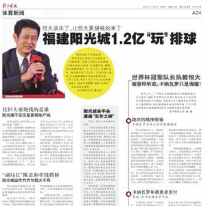 曾经500万年薪请来郎平[微博]的恒大[微博]集团,去年逐渐淡出排球圈。就在人们担心女排联赛市场会就此冷淡时,好消息传来:福建阳光城集团前天(11月4日)在福州宣布,他们将斥资1.2亿元,分四年投入排球,正式组建福建阳光城女排俱乐部。