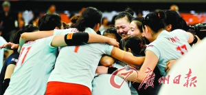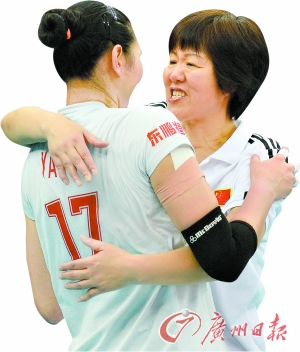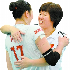 主教练郎平在球队赢得这场关键之战后激动地拥抱球员。