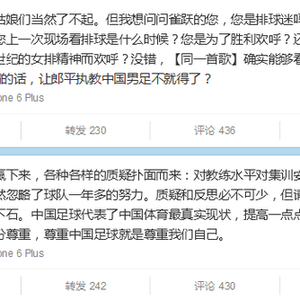@多蠢是蠢:段暄说的没错所谓女排精神只是空的 真正夺冠的因素是女排的实力 对于许多几乎不看体育比赛的人来说最后记住的只是“精神”忽略了竞技体育最重要的实力 从而引申出男足的问题 男足不缺精神 总有人说男足不行 男足XXX 为了黑男足而黑 其实相比与大家追捧的女排来说男足更需要大家的认可鼓励和政策的支持