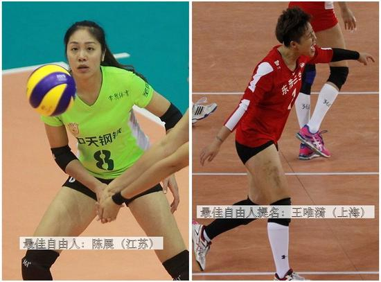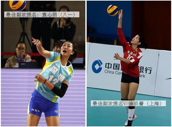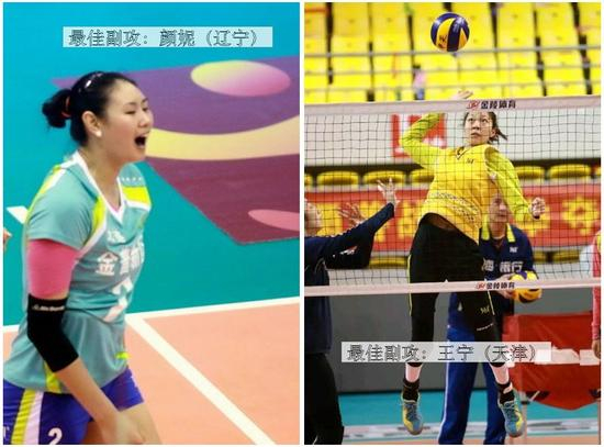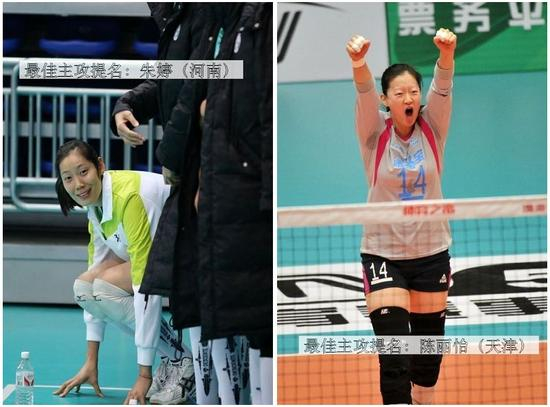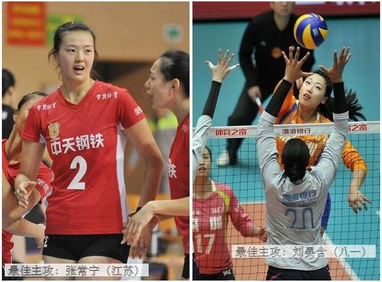 最佳主攻:张常宁(江苏)/刘晏含(八一),提名:朱婷[微博](河南)/陈丽怡(天津)