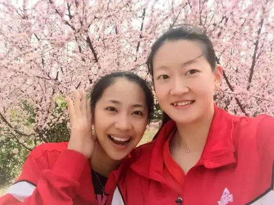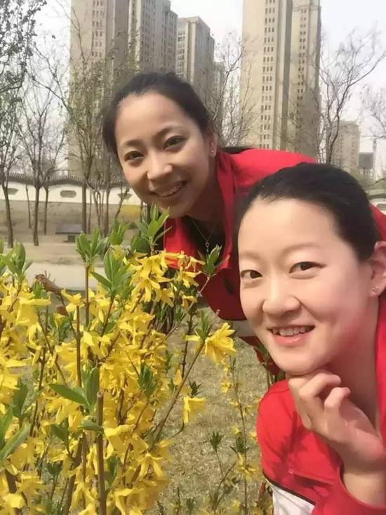 王茜[微博]和陈丽怡在繁忙的训练间隙一同在朋友圈发布了一组赏花照片,并感慨:“终于可以出来赏花了,就是穿的哈哈……”