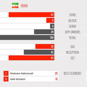 个人得分方面,中国队张晨和仲为君均得到本队最高的20分,耿鑫和袁志分获13分和12分,陈龙海获得6分,出战了前两局的戴卿尧贡献4分,李润铭、焦帅、饶书涵各入账1分。伊朗队马赫穆迪独揽25分荣膺得分王,格拉米和穆萨维分获15分和13分,埃巴迪波尔入账11分,替补米尔扎扬波尔得到6分,加艾米和扎里尼均贡献5分。
