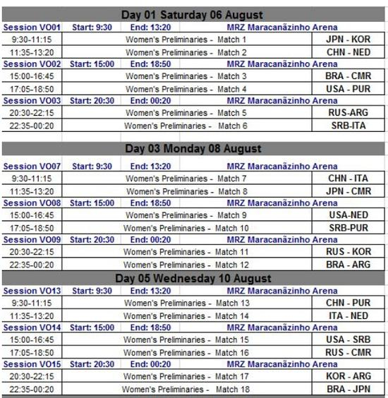 国际排联于洛桑当地时间6月7日公布了小组赛赛程,中国女排将在里约当地时间8月6日11:35(北京时间8月6日22:35)率先迎战荷兰,里约当地时间8月8日09:30(北京时间8月8日20:30)中国女排对阵意大利,里约当地时间8月10日09:30(北京时间8月10日20:30)中国女排对阵波多黎各,里约当地时间8月12日09:30(北京时间8月12日20:30)中国女排激战塞尔维亚,里约当地时间8月14日17:05(北京时间8月15日04:05)中国女排对垒美国。